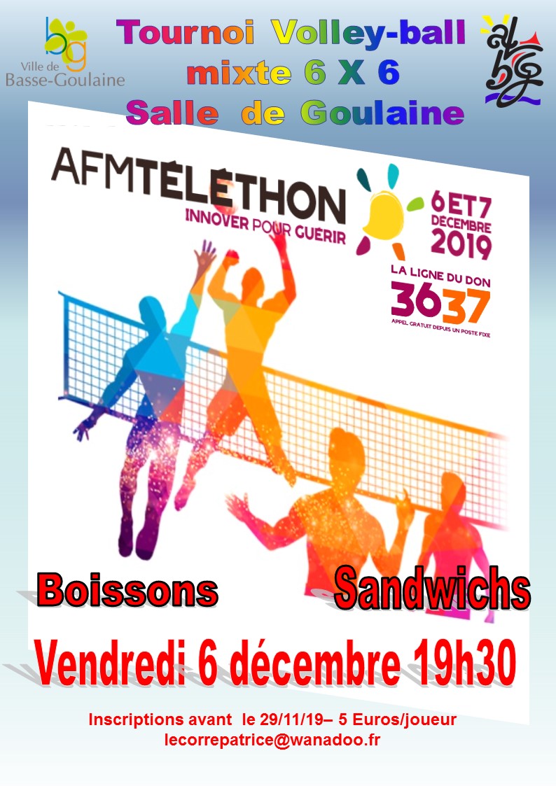 Les fonds prévus pour la location des rosalies par notre association, seront versés au Téléthon, à l’occasion de l’animation organisée par la section Volley de l’Amicale Laïque de Basse Goulaine (ALBG) pour la collecte de fonds pour le Téléthon: un super tournoi de volley le vendredi 6 décembre, à 19h30, salle de Goulaine!