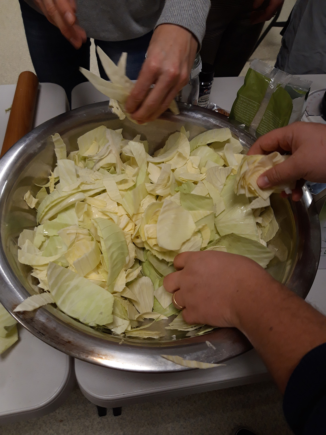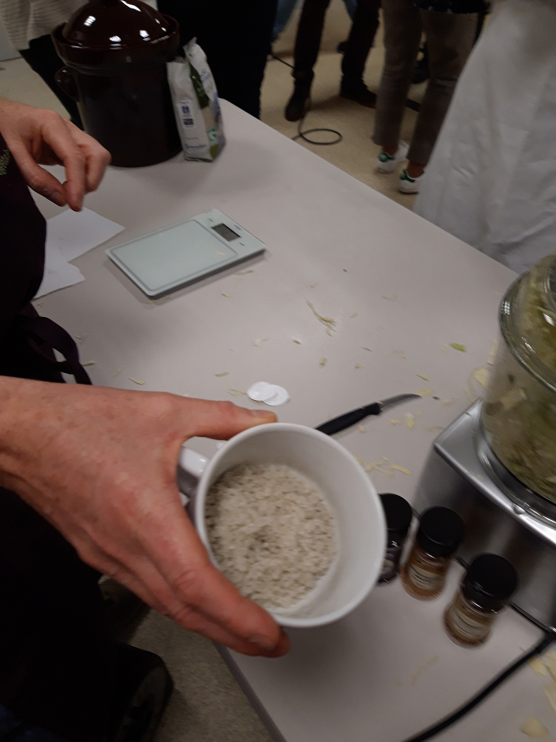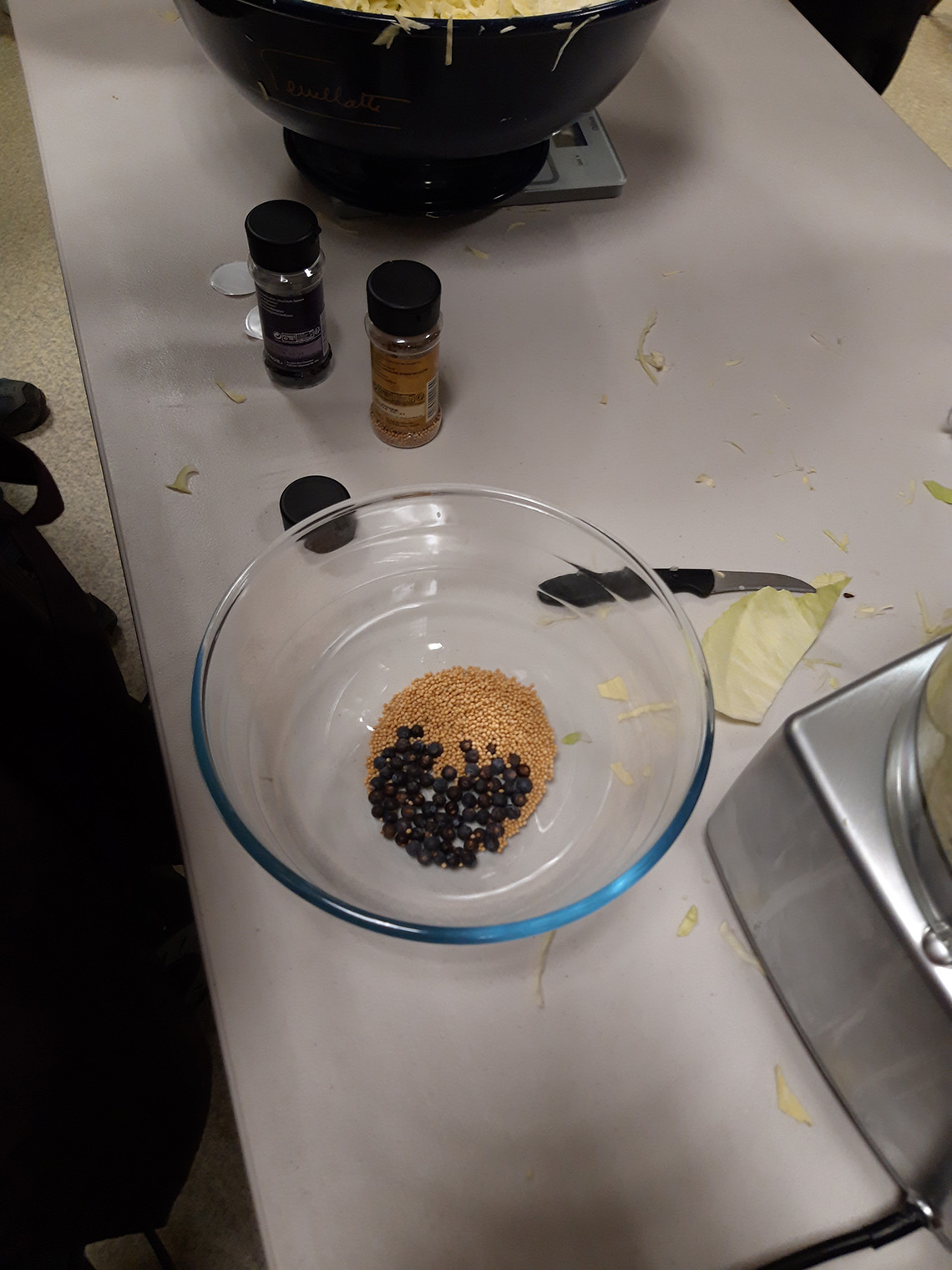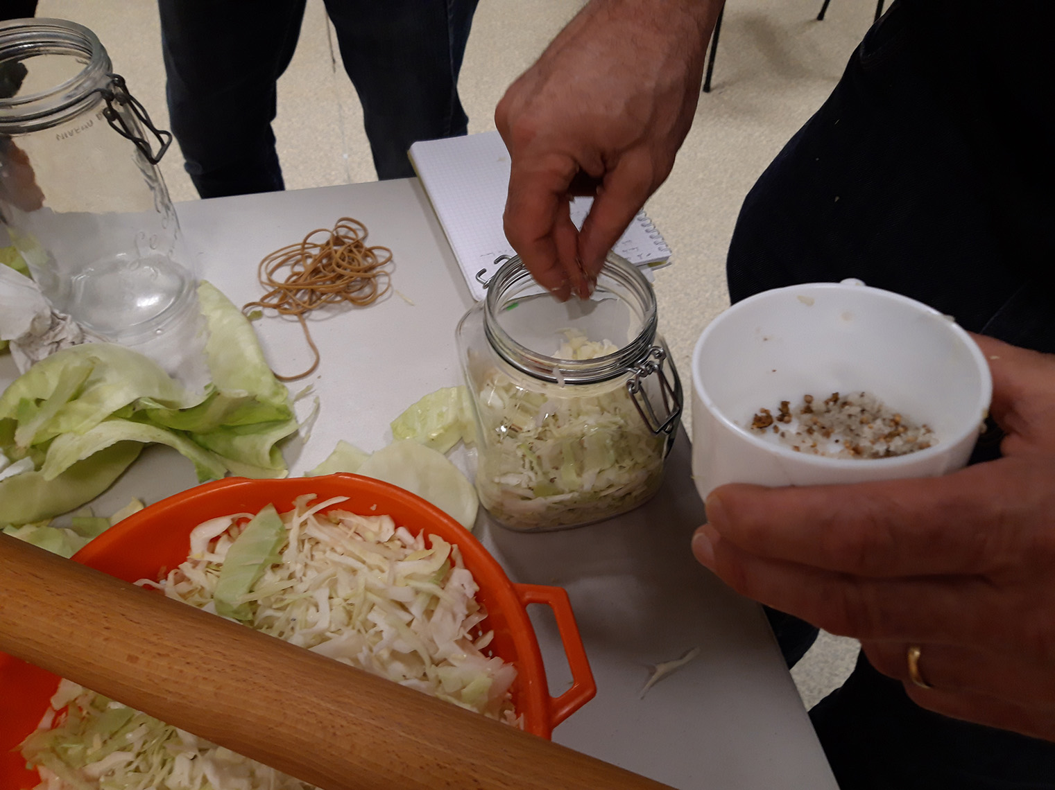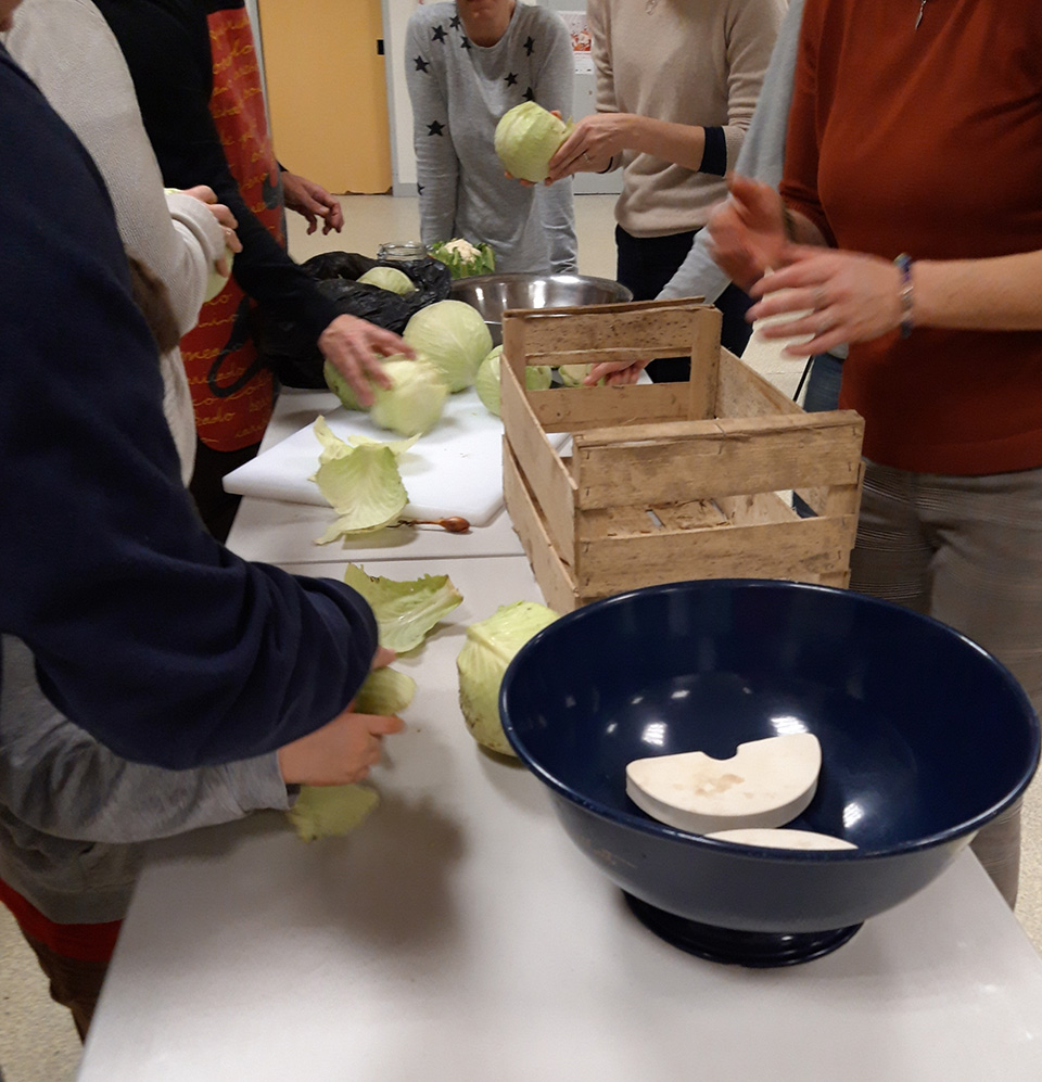 - prĂ©parer 1% du poids du lĂ©gume , en Ă©pices /sel (donc si 1kg de chou, 10 g de sel) Les aromates peuvent ĂȘtre un peu de poivre en grain, du laurier et un peu de thym. On peut aussi ajouter de la cardamone, des clous de girofles, des baies de geniĂšvre etc.