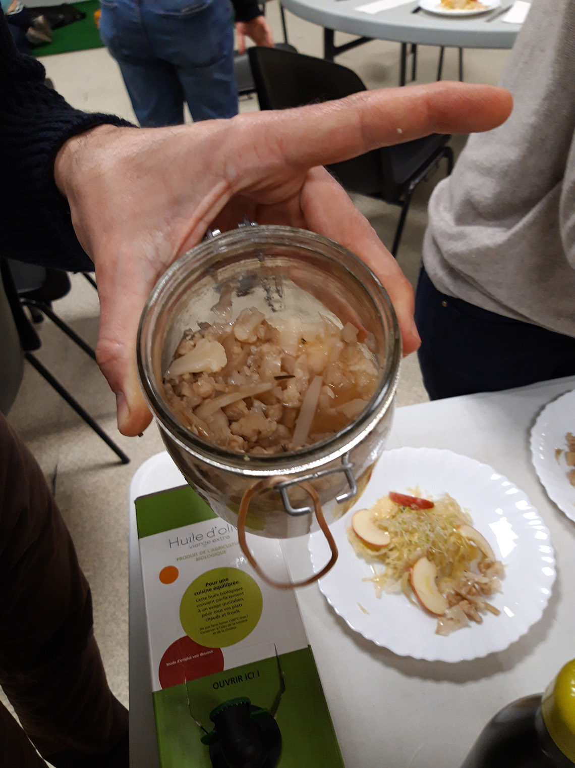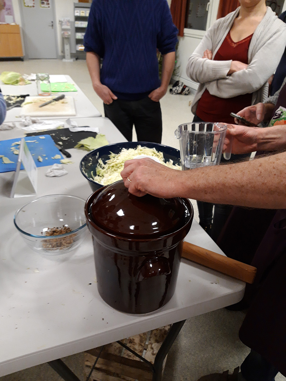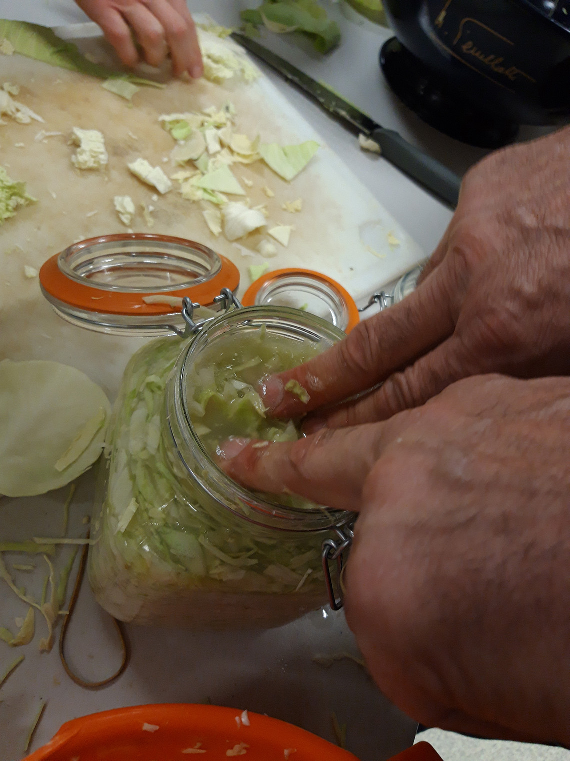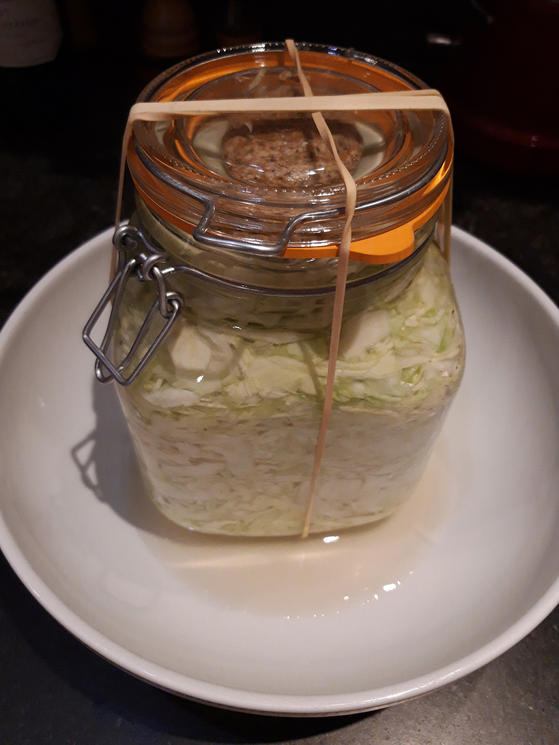 - Une fois le bocal rempli (veillez Ă laisser un peu de place entre la fermeture et les lĂ©gumes pour que la saumure immerge complĂštement les lĂ©gumes, afin de faire barriĂšre avec lâair), rajouter une feuille de chou et poser un poids (un caillou rond par exemple, et refermer le couvercle sur le bocal sans le bloquer complĂštement avec le levier en mĂ©tal au dĂ©but (mettre un Ă©lastique pour maintenir la fermeture)