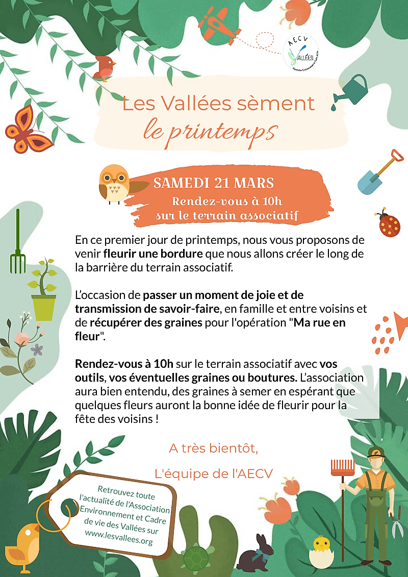 Nous vous proposons par ailleurs de venir fleurir une bordure que nous allons créer le long de la barrière de notre terrain associatif. Alors venez avec vos outils, vos boutures… car le 21 mars, on sème le printemps aux Vallées!