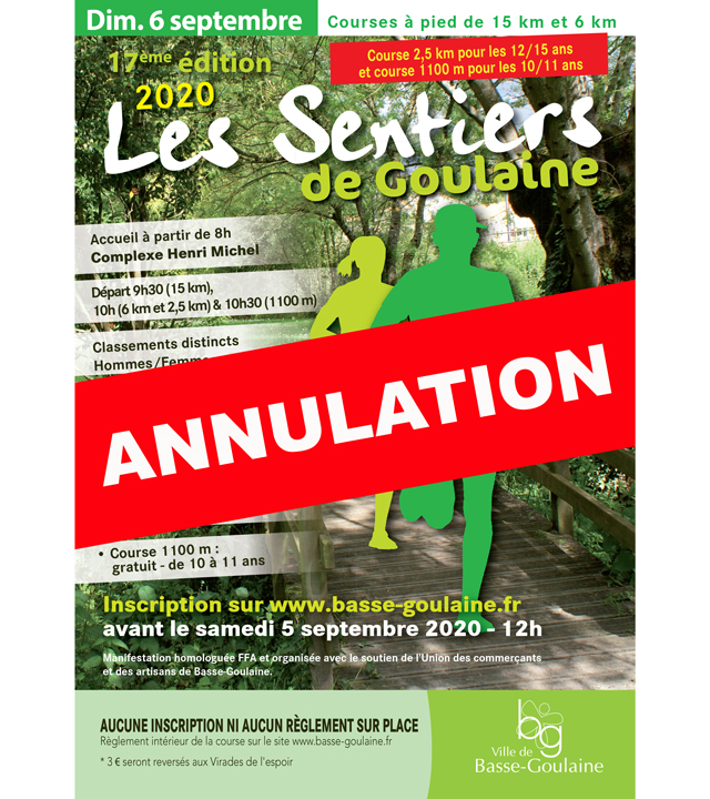 « La course des Sentiers de Goulaine devait se tenir ce dimanche 6 septembre. Mais en raison des contraintes imposées dans le cadre de la gestion de la crise sanitaire, la manifestation est annulée, considérant la difficulté de respecter les consignes sanitaires au vu du nombre de participants » annonce la Ville de Basse Goulaine 5 jours avant la manifestation.