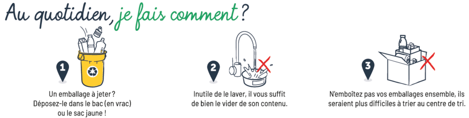 - Les déchets ménagers (jouet en plastique cassé, vaisselle, couches, brosse à dent, mouchoirs, essuie-tout…) sont à jeter dans votre poubelle ordinaire.