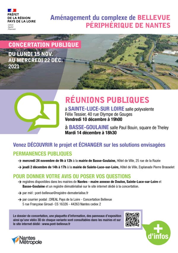 Deux rĂ©unions publiques de prĂ©sentation et dâĂ©changes sont organisĂ©es Ă Sainte-Luce-sur-Loire le vendredi 10 dĂ©cembre 2021 Ă 19h- et Ă Basse-Goulaine le mardi 14 dĂ©cembre 2021 Ă 18h30.