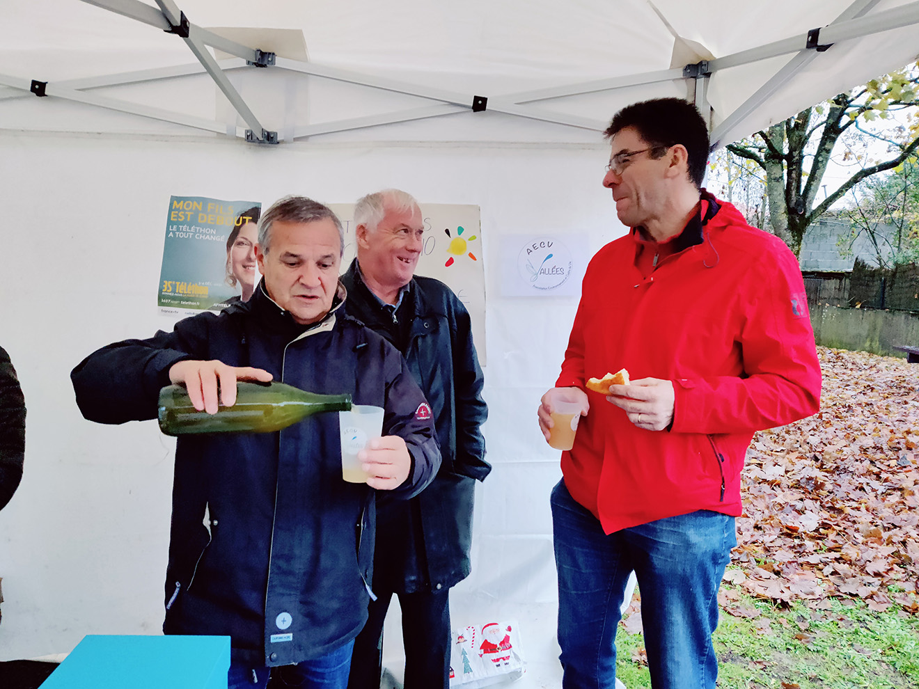 - cueillettes de pommes aux Vallées puis atelier fabrication jus de pomme 100% naturel, et vente au village au profit du Téléthon en octobre et novembre 2021