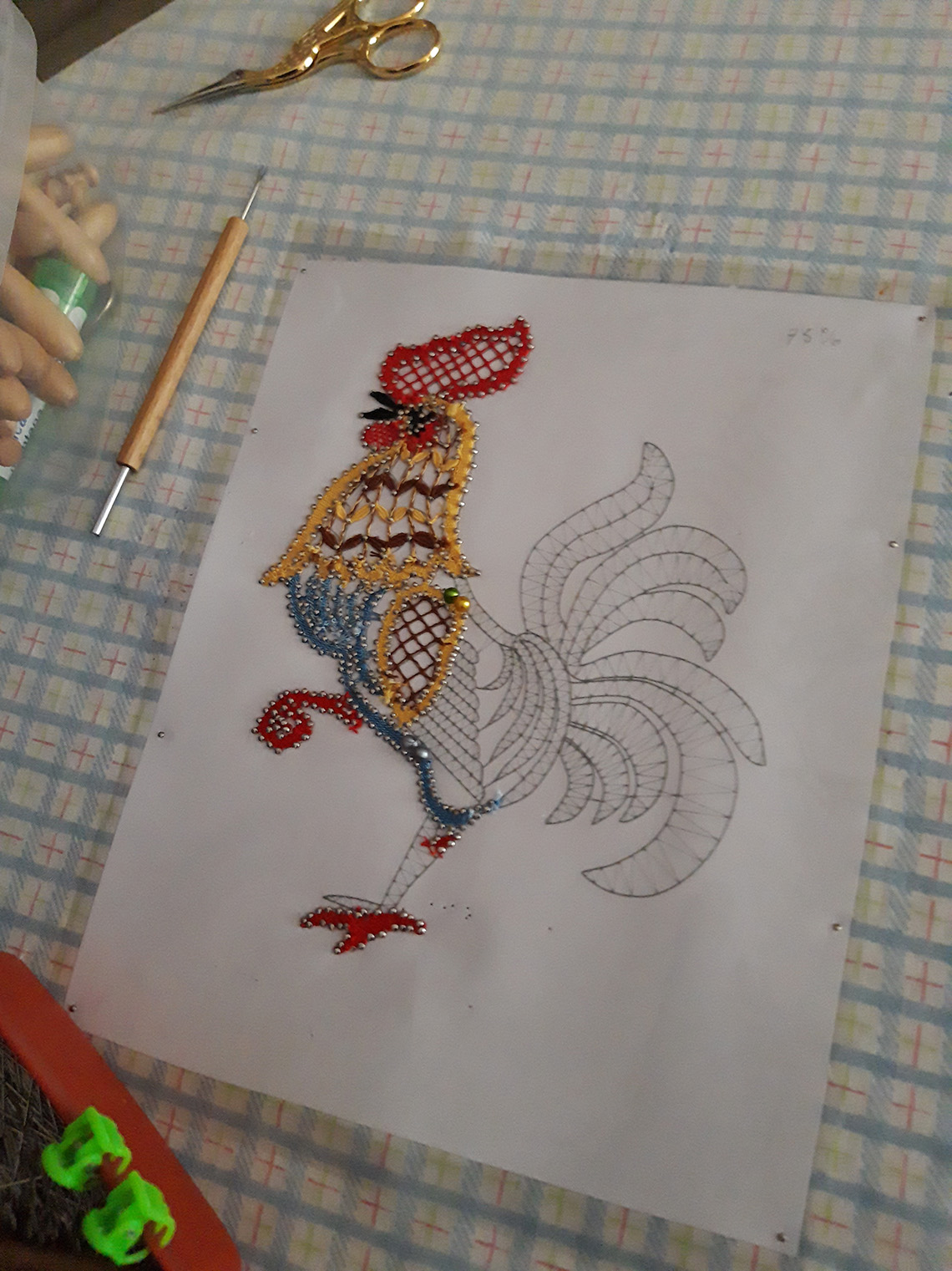 À partir d’un carton fixé sur un carreau, on dessine un modèle sur lequel on fixe des piqûres afin de délimiter les motifs. On place les épingles et on prépare les fuseaux portant les différents coloris de fil.
