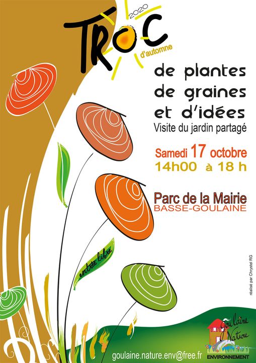 Samei 17 octobre de 14h à 18h au parc de la Mairie de Basse-Goulaine, venez échanger vos plantes, boutures, graines et astuces. Vous pourrez en profiter pour visiter le jardin partagé et découvrir les activités de l'association organisatrice de l'événement Goulaine Nature Environnement. La manifestation se déroulera en plein air mais sortez votre plus beau... Lire la Suite →