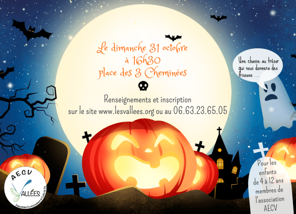À l'occasion de la fête d'Halloween le dimanche 31 octobre 2021, nous proposons une chasse à l'épouvante pour les enfants des Vallées. Chasse à l'épouvante Nous donnons rendez-vous aux enfants de 4 à 12 ans accompagnés de leurs parents, le dimanche 31 octobre 2021 à 16h30, place des Trois Cheminées pour un moment de frissonnante... Lire la Suite →